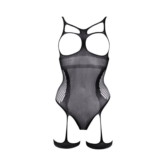 Open-cup fishnet teddy with a strappy neckline and open crotch. The teddy has attached leg bands. Also perfect to combine with a bikini top and denim shorts for a cool festival outfit. This bodystocking fits size S-XL. Thong not included. Hand wash or hand wash programme, cold water, dry flat, do not tumble dry, do not iron.