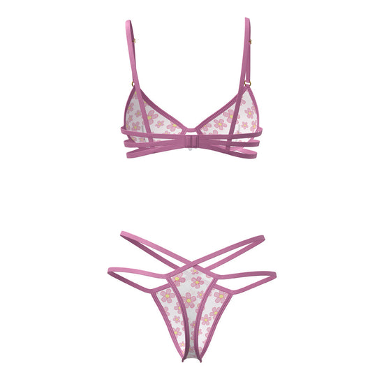 With daisy beads and lilac accents, each detail is a petal in a breathtaking bouquet. Adjustable shoulder straps with gold-tone sliders resemble vines reaching for the sky, while the high-rise strappy thong is the delicate stem that supports your allure. This set is designed to flatter and empower you, whether you’re teasing a partner or indulging in a solo fantasy.