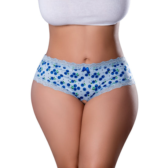 Venture through Fantasies Boutique's orchard of temptation with our Magic Silk Sweet Treats Crotchless Boy Short with Lube in Blueberry. These silky microfiber panties feel like satin petals against your skin, adorned with succulent fruit prints and delicate lace trim. The split crotch opens a secret garden, inviting exploration and exhilarating anticipation.