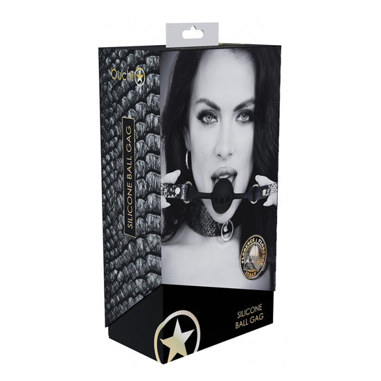 Turn up the heat with the Ouch! International Florence Collection Silicone Ball Gag in Black, available at Fantasies Boutique. This provocative accessory blends daring play with high-fashion design for nights you both won't soon forget.