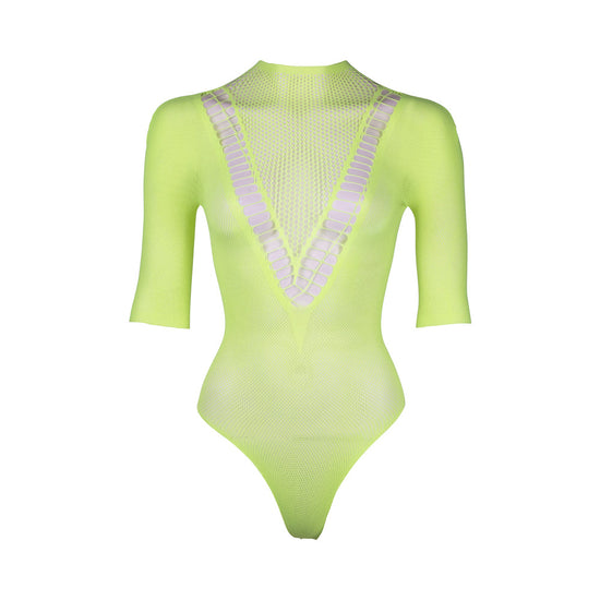Round-neck fishnet body with contrast V-neckline. The body has short sleeves and a keyhole at the back. This bodysuit fits size S-XL. Thong not included. Hand wash or hand wash programme, cold water, dry flat, do not tumble dry, do not iron.