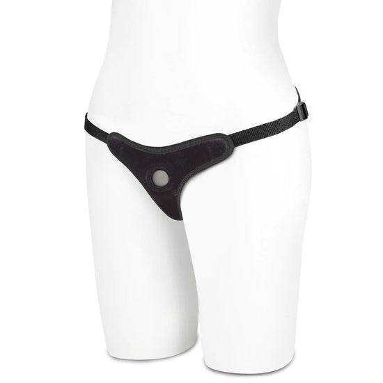 Strap it on and take control with this sleek black velvet harness from Lux Fetish. Fully adjustable harness can accommodate any dildo with a flared base. Great for new initiates just discovering the joys of deep penetration, or for experts looking to add another tool to their arsenal. Four-way adjustable straps fit hips up to 60 in.