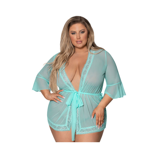 From the Exposed by Magic Silk collection, this style includes: a flowy, thigh-length robe featuring breathable mesh trimmed with lace, fluttery bell style mid-length sleeves, with a matching stretchy mesh belt.