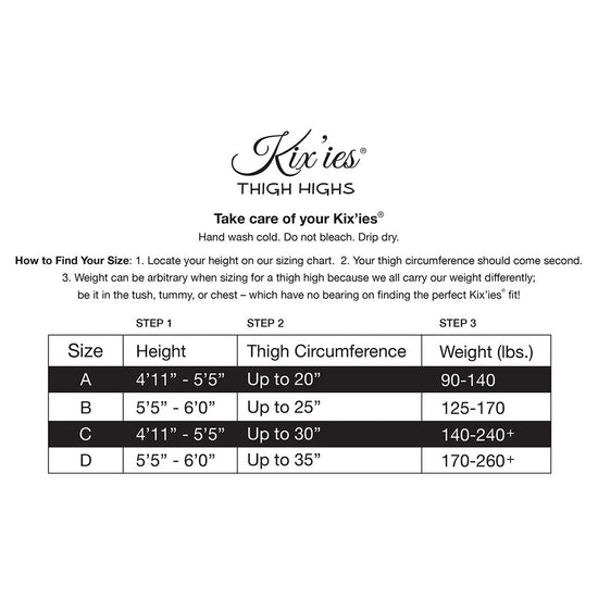 Measure by height first and thigh circumference second. Weight can be arbitrary when sizing for a thigh-high. We all carry our weight differently; be it in the tush, tummy or thighs—which have no bearing on finding the perfect Kix'ies fit! Time to kick those binding tights and outdated hosiery to the curb!