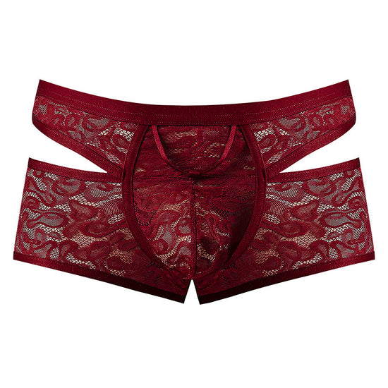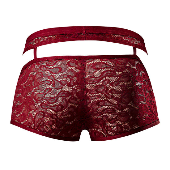 Ignite your intimate wardrobe with the sinfully delicious Lucifer Cut Out Short by Male Power, now in burgundy. This luxurious men's lace underwear blends daring peek-a-boo cutouts with a curlicue floral lace pattern for a look that's equal parts seductive and sophisticated.